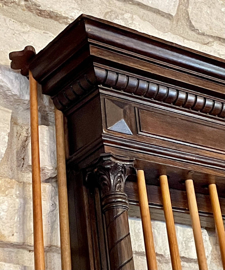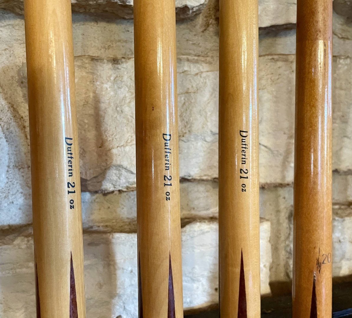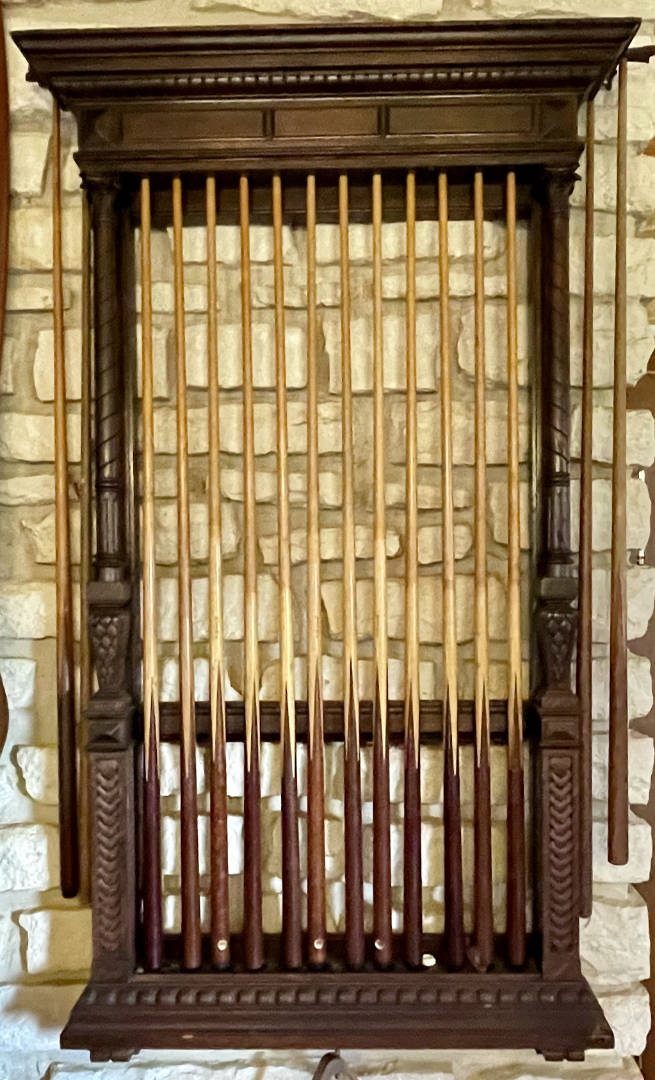 A turn of the century antique oak pool cue rack with 12 vintage Dufferin one-piece cues and 3 bridges. $1850